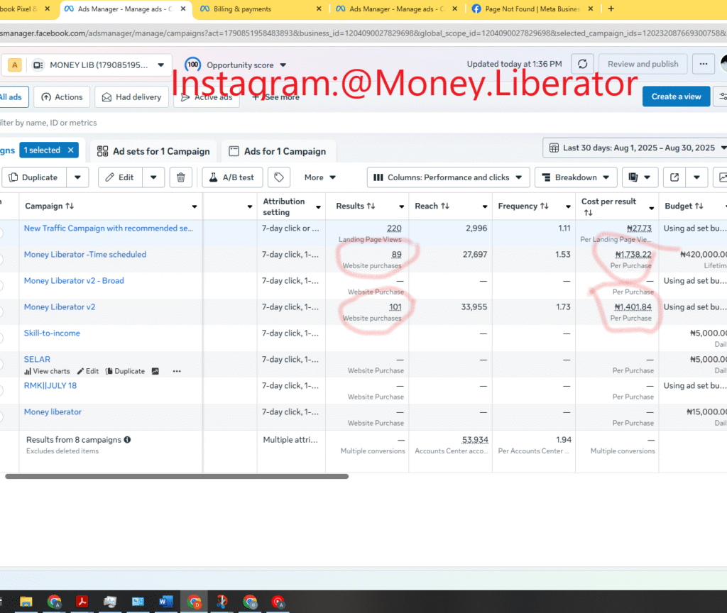 BELOW IS MY FACEBOOK DASHBOARD FOR AUGUST 1ST-30TH WHERE I MADE over 170 SALES AT #1700 /PURCHASE ON FACEBOOK